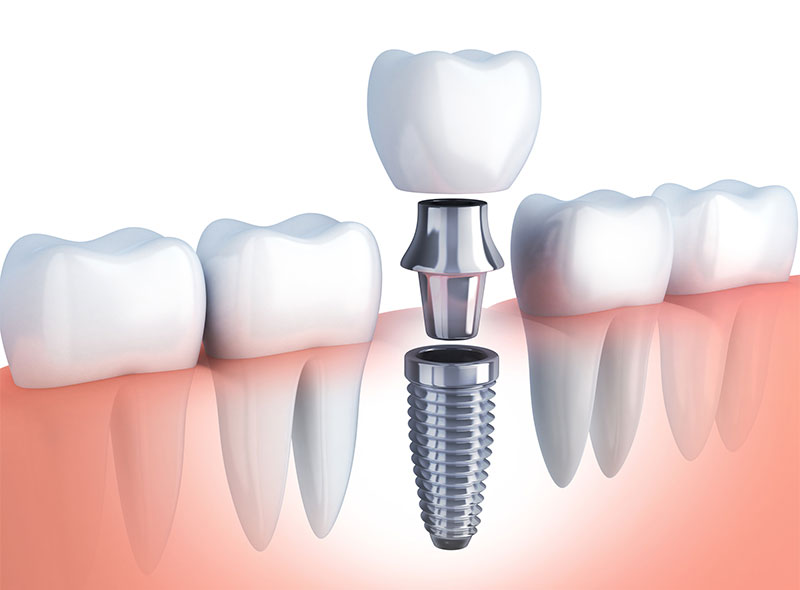インプラントとは、歯が抜けてしまった箇所の顎の骨に人工歯根を埋め込み、その上から上部構造という人工の歯を被せる治療方法です。歯は1本1本がお互いに支えあって生えているため、抜け落ちた歯を放置しておくと、歯並びが悪くなるなど周辺の歯に影響を及ぼすことがあります。金具で補強する部分入れ歯や隣り合った歯に被さるようなブリッジ手術と異なり、インプラント治療は、他の歯に負担をかけることなく抜けた歯を補うことが可能です。