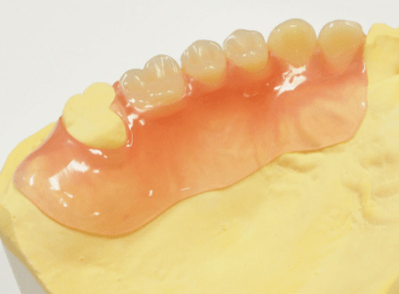 金属のバネを使用しない、歯肉の色に近い入れ歯です。見た目が自然なだけでなく、保険適用内の入れ歯に比べて強度と柔軟性に優れているというメリットもあります。