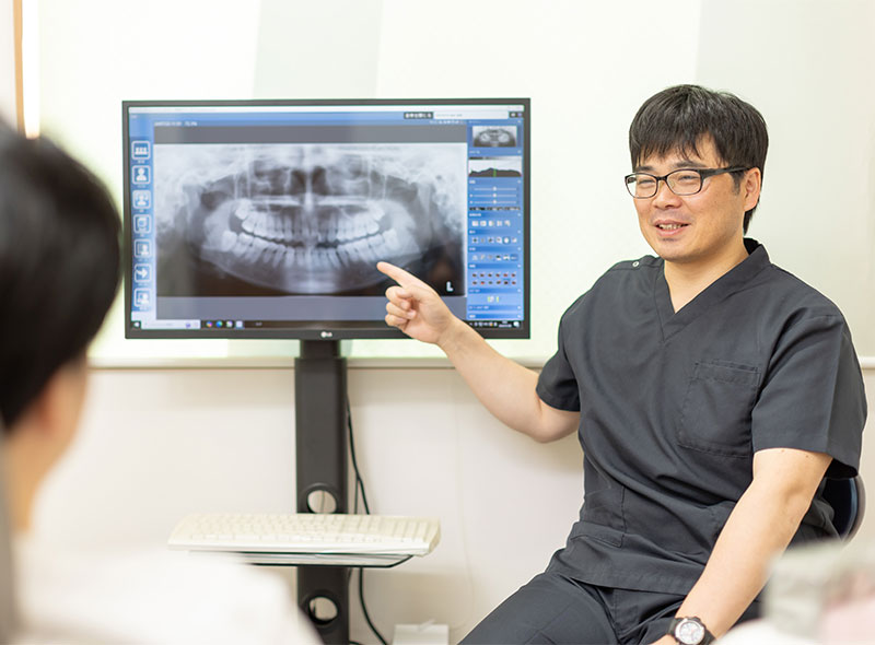 まず治療を受けたい理由・悩み・ご要望をよく聞きまして、今の歯の状態とインプラント治療を行うために不可欠な条件が全てそろっているかを確認します。